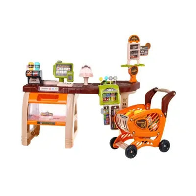 - supermarket s policemi, nápukní vozík, pokladana s čtečkou karet,scaner, nápojový automat, polička na bankovky, mince, 2x zavírací pohárek na nápoje, 2x džus